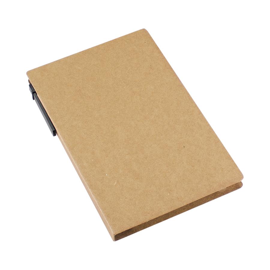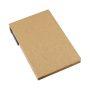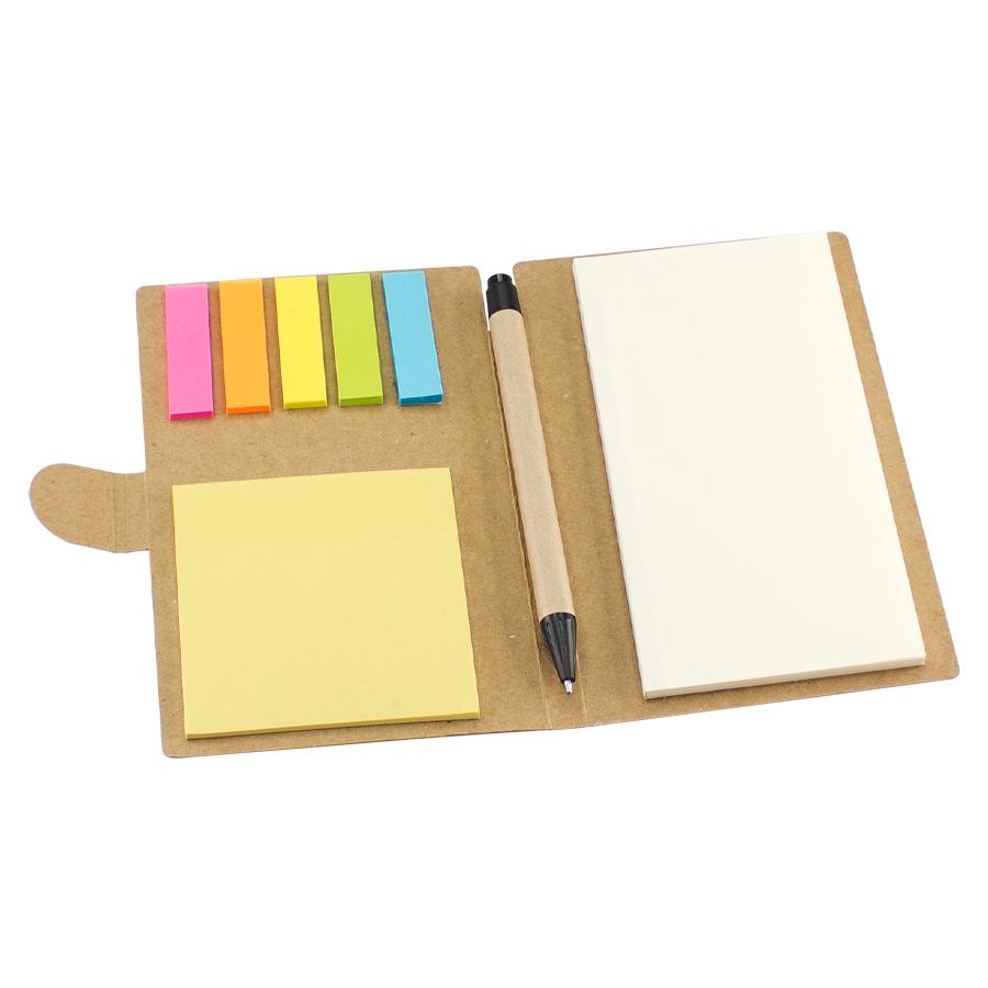 Memo set Ecológico Grande de Cartón natural. Incluye Bolígrafo Ecológico, 50 notas adhesivas amarillas claras grandes de 14.4 x 7.5 cm, 25 notas adhesivas amarillas medianas de 7.7 x 7.7 cm y 125 banderitas adhesivas de colores de 4.5 x 1.3 cm.