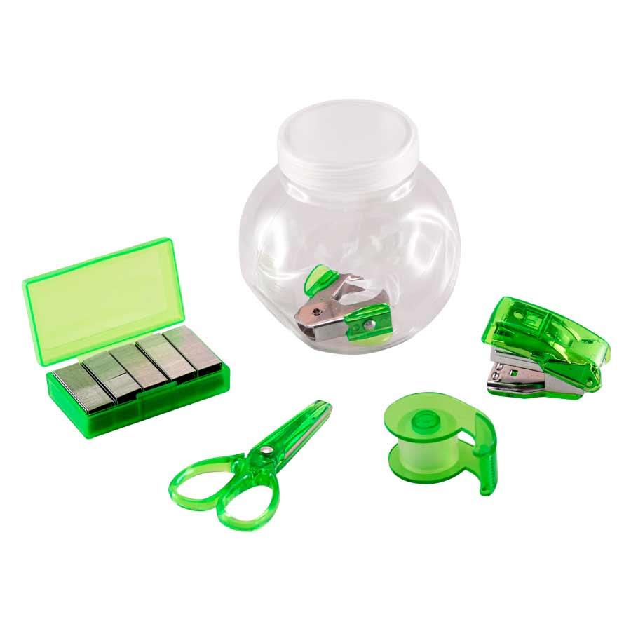 Set de oficina en frasco plástico transparente con tapa frozen. Ideal espacio para logo en tapa.