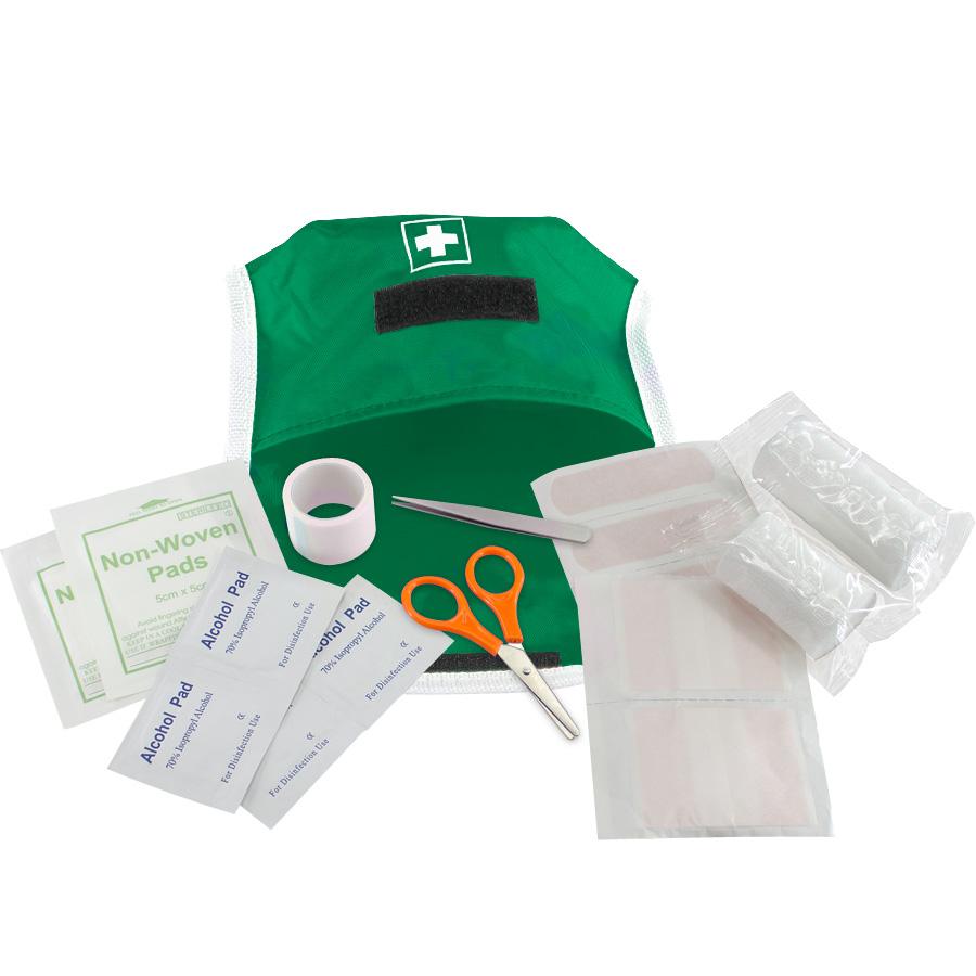 1 Tijera, 1 Pinza, 1 Rollo de Gasa elasticada de 3 x 7 cm, 1 Rollo de Gasa elasticada de 3 x 5 cm, 4 Toallas Húmedas con alcohol gel, 1 Cinta Adhesiva, 2 Parches Curitas de 6 x 5 cm, 2 Parches de Gasa estériles de 5 x 5 cm, 4 Parches Curitas bordes redondeados de 7 x 2 cm.