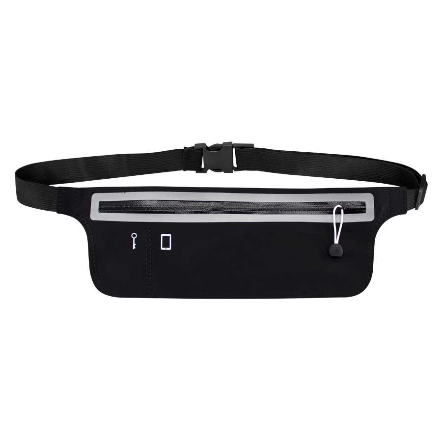 Banano impermeable, en tela Polyester Stretch 210 Waterproof. Incluye banda-cinturón elasticado ajustable color negro, bandas reflectantes color plateado, cierre-eclair impermeable y doble compartimento, uno para smart-phone, otro para accesorios como llaves o monedas.