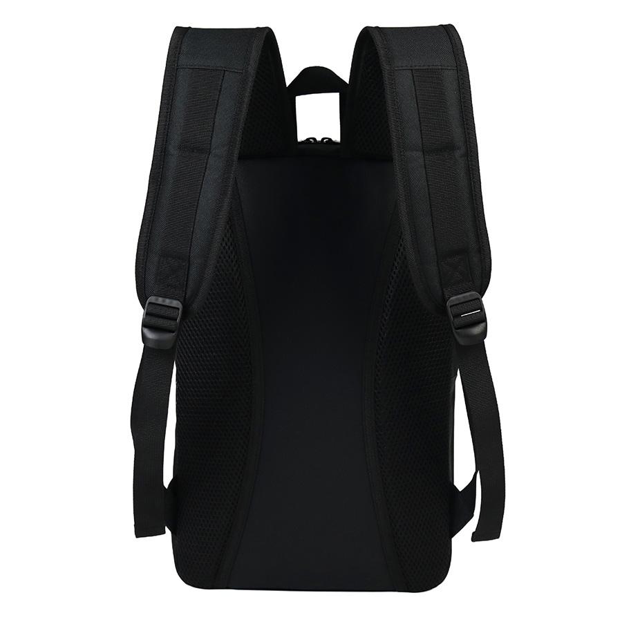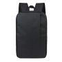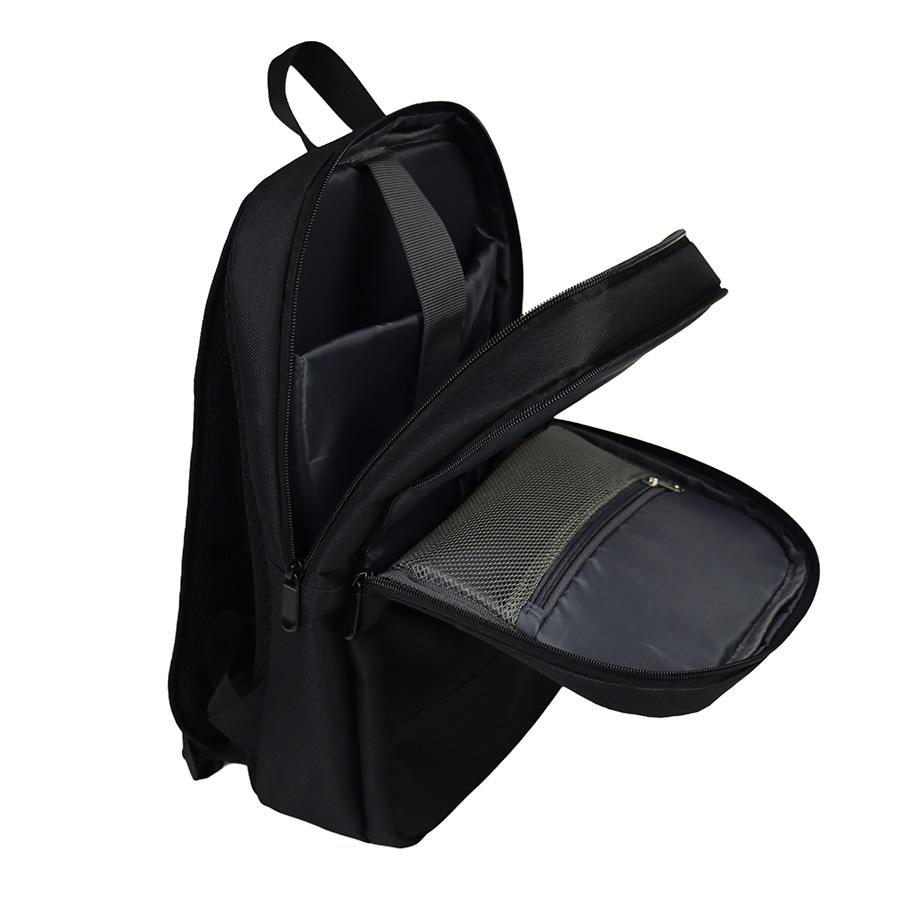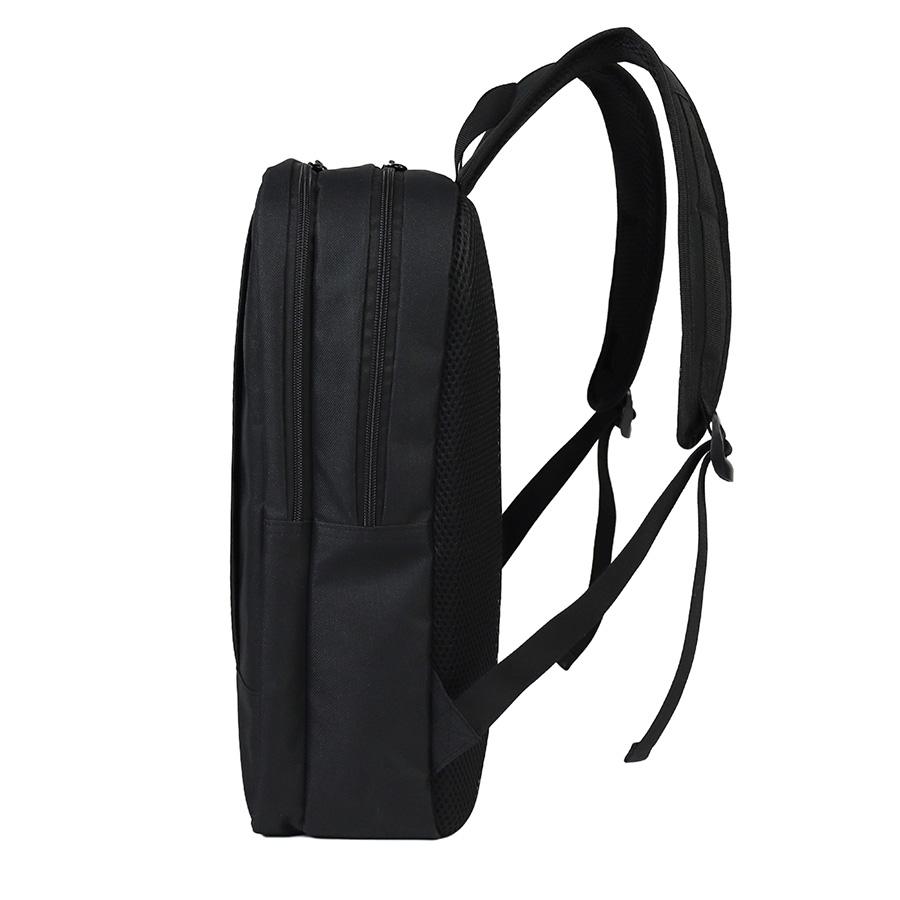 Mochila Porta-Notebook modelo “FORT”. Fabricada en tela poliéster 600D/PVC. Capacidad 14 litros, tamaño 28 x 42 x 12 cm. Contiene 2 compartimentos interiores forrados en nylon, cuerpo completo: uno posterior (de seguridad) y otro central, ambos reforzados y acolchados, además de 2 compartimentos (bolsillo) delantero con cierre cremallera lateral. Espalda acolchada con red de ventilación.