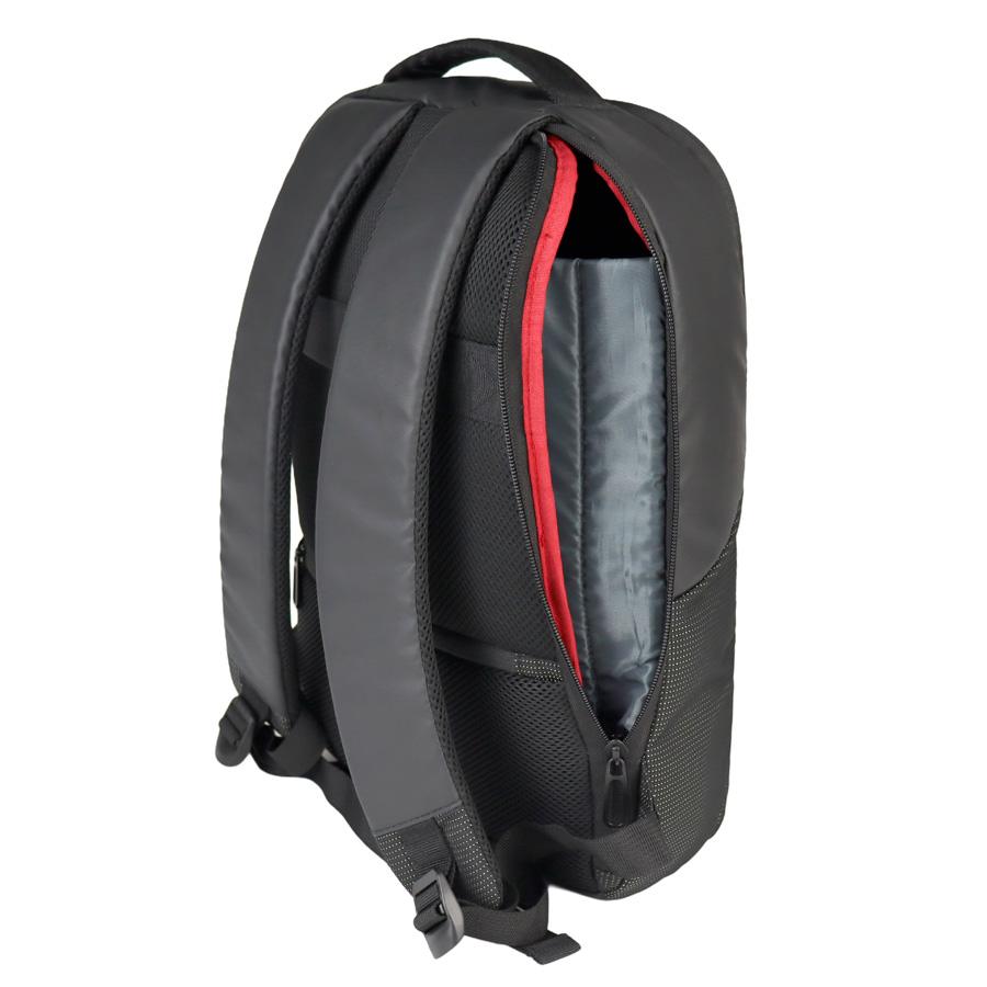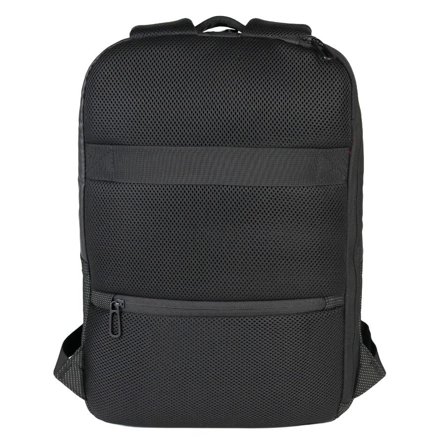 Deluxe Mochila Porta-Notebook modelo “WENZER”. En tela poliéster mallado con membrana epitelial + eco-cuero PU 840D. Capacidad 16 litros, tamaño 30 x 44 x 12 cm. Cuenta con compartimiento delantero para notebook y tablet, + bolsillo delantero + compartimento principal con apertura posterior lateral (en vertical) de seguridad, para acceso directo a la notebook. Sujetador de Carry-on. Espaldar y correas regulables acolchados, y un cuarto compartimento (bolsillo) en el espaldar, para guardar elementos pequeños con máxima seguridad anti-robos.