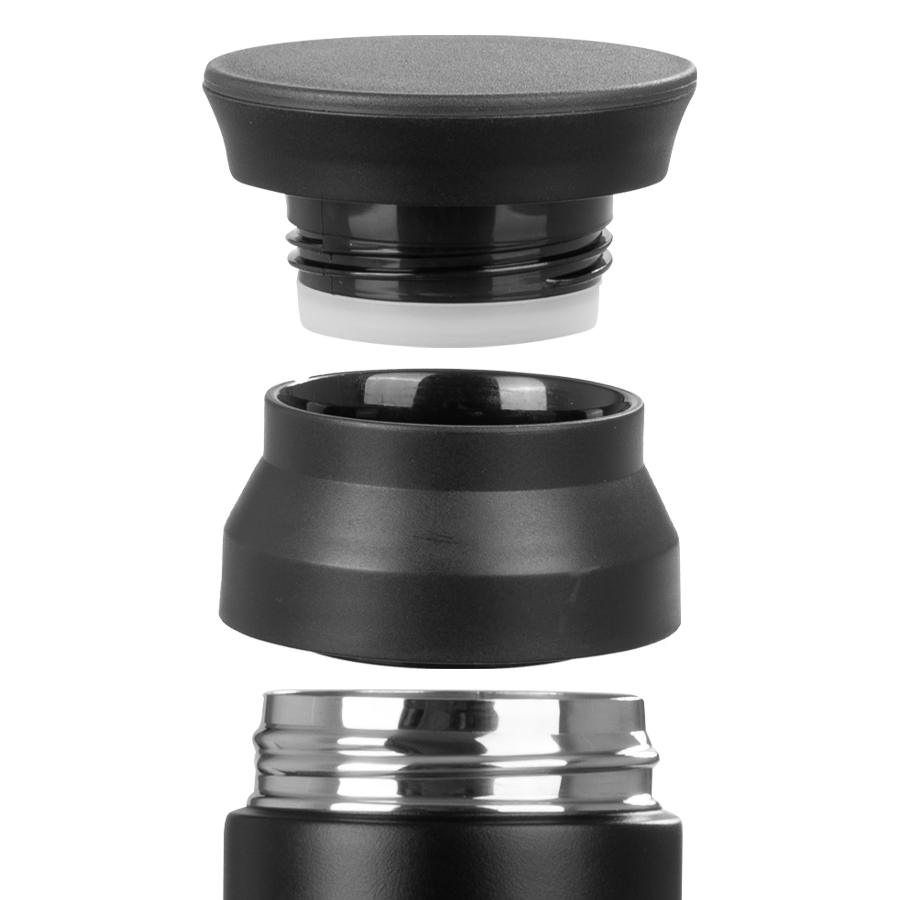 Botella térmica metálica doble pared aislante, cubierta de Polipropileno (PP) acabado mate, interior Acero inoxidable 304 SS, exterior Acero inoxidable 201 SS, modelo “SMART LID”. Incluye doble tapa rosca de plástico PP negro, con sello cilíndrico de silicona, sistema de filtro circular y termómetro digital en la tapa superior, que marca la temperatura del líquido interior. Capacidad 480ml. Producto BPA FREE, para el contacto con líquidos y alimentos. Presentación en bolsa plástica transparente + caja de regalo de cartón laminado negro.