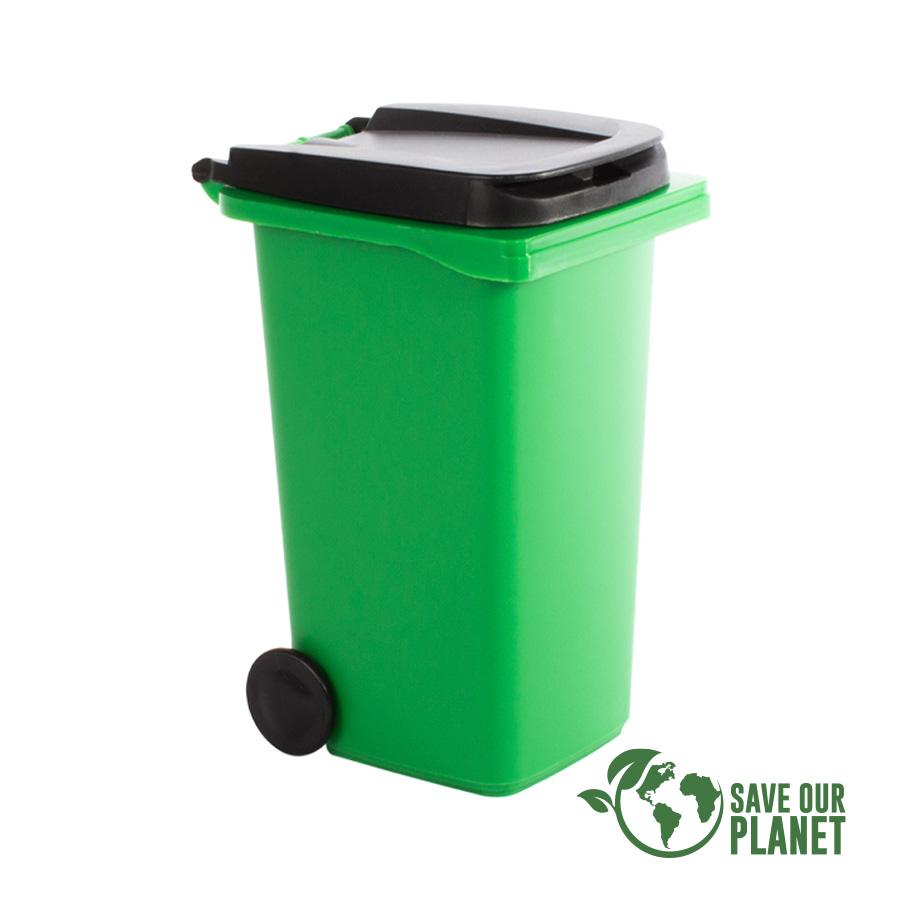 Mini Basurero Verde de Sobremesa plástico verde, con tapa y ruedas negras.