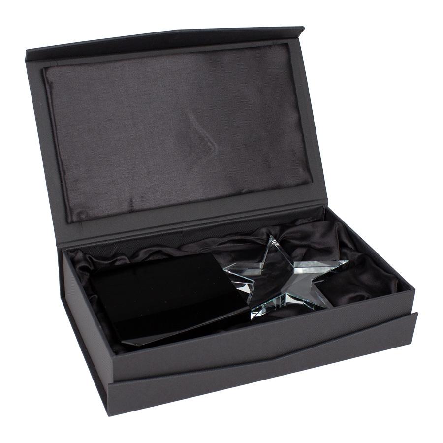 Elegante Trofeo modelo “Biondi”, base de cristal negro y estrella de cristal en su parte superior. Presentación en caja de cartón forrado negro con cierre imantado, interior acolchado de espuma y tela poliéster satinado negro, con troquel.