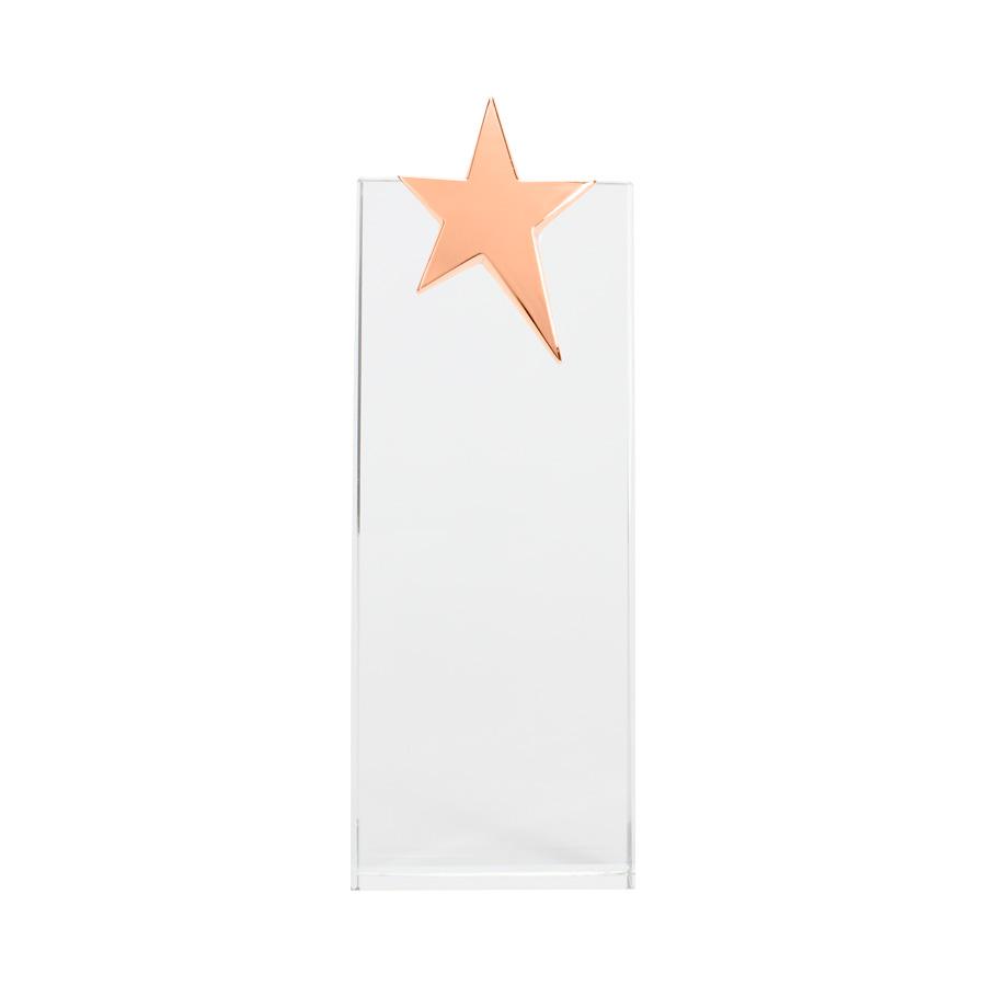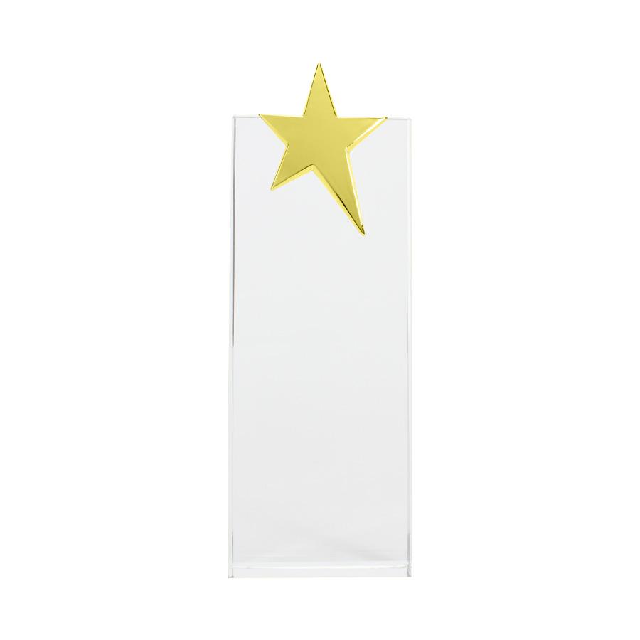 Elegante Trofeo Galvano de Cristal modelo “Ledecky”, con estrella de acero inoxidable de color metalizado en su parte superior. Presentación en caja de cartón forrado negro con cierre imantado, interior acolchado de espuma y tela poliéster satinado negro, con troquel.