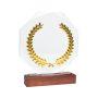 Elegante Trofeo modelo “Phelps”, base de madera barnizada y cuerpo de cristal con hojas de laurel doradas en acero inoxidable. Presentación en caja de cartón forrado negro con cierre imantado, interior acolchado de espuma y tela poliéster satinado negro, con troquel.
