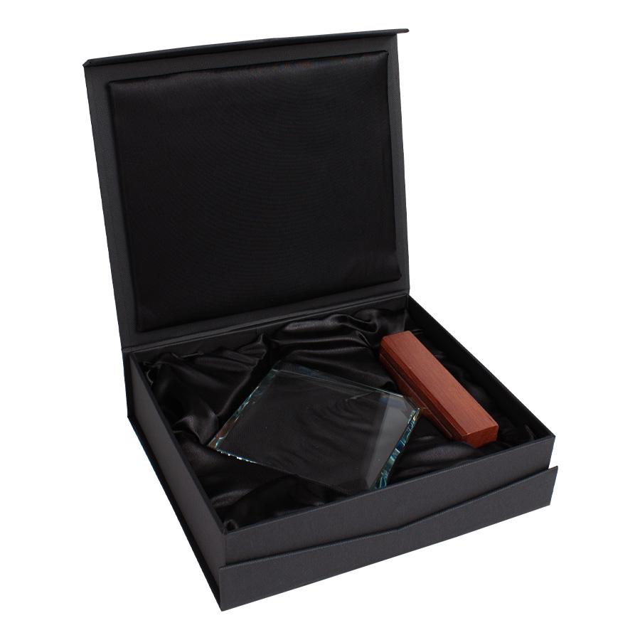 Elegante Trofeo modelo “Fischer”, base de madera barnizada y cuerpo de cristal. Presentación en caja de cartón forrado negro con cierre imantado, interior acolchado de espuma y tela poliéster satinado negro, con troquel.
