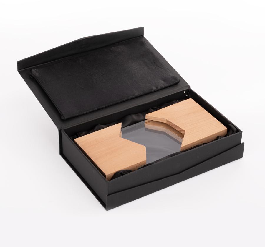 Elegante Trofeo Galvano modelo “Steven”, en madera de pino barnizado, con incrustado de cristal en la zona central. Presentación en caja de cartón forrado negro con cierre imantado, interior acolchado de espuma y tela poliéster satinado negro, con troquel.