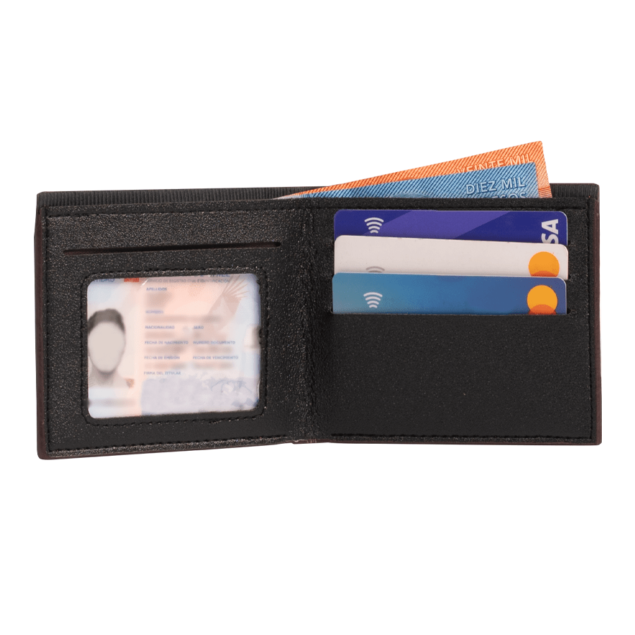 Billetera de eco-cuero color café, modelo “DENVER”. Contiene 6 compartimentos interiores. Presentación en bolsa frozen.