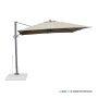 Quitasol lateral cuadrado de 3x3m, con 4 cascos de lona Poliéster UV impermeable de 200g. Contiene asta de Aluminio de 80x50mm x 2.47m de altura y 8 varas de acero. Sistema de apertura manual con regulación de altura y ángulo para sombra. Sistema manual de rotación 360°.