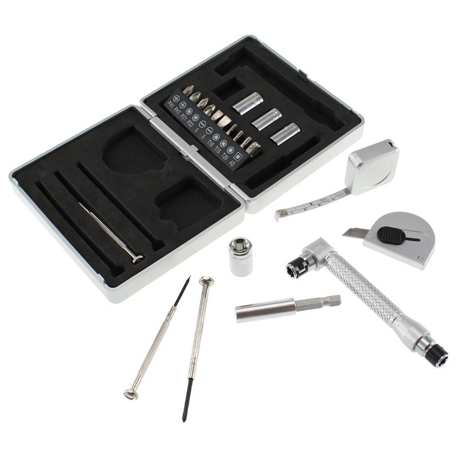 Set de 21 prácticas herramientas en caja rígida plástica plateada. Amplia área para impresión.