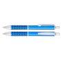 Bolígrafo metálico satinado modelo “Caterpillar”, con lunares de goma negra que brindan una suave sensación de masaje dactilar al escribir. Escritura azul.