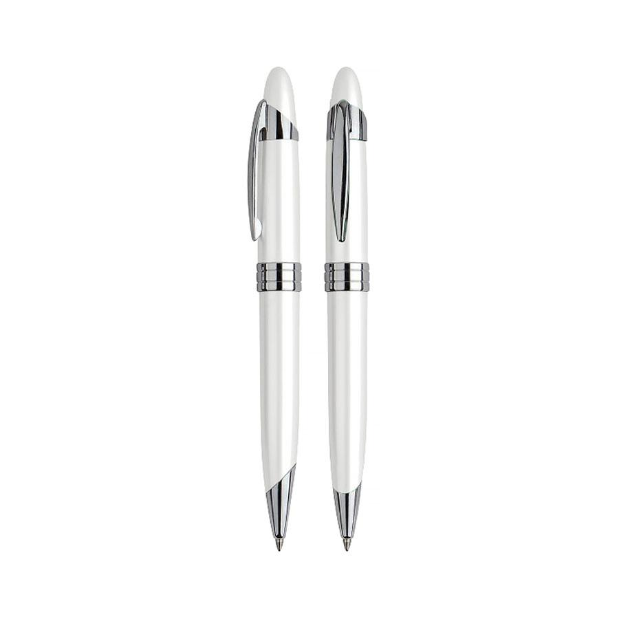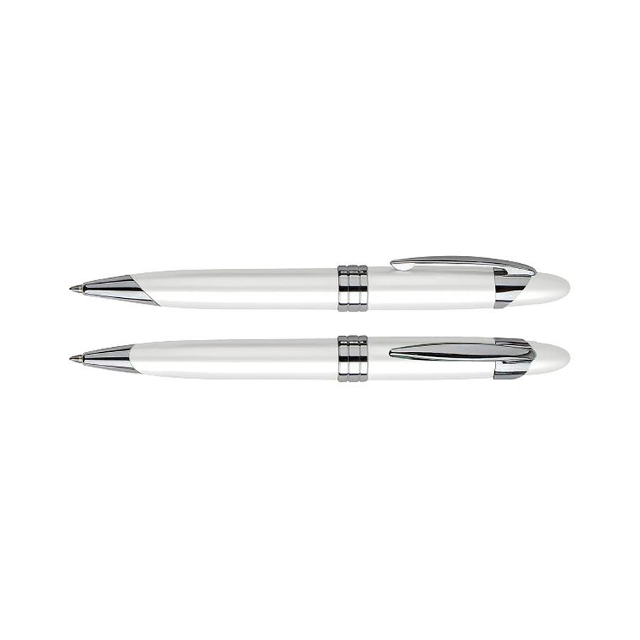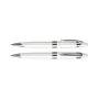 Bolígrafo metálico modelo “White Pearl”, con terminales cromados plata. Escritura azul.