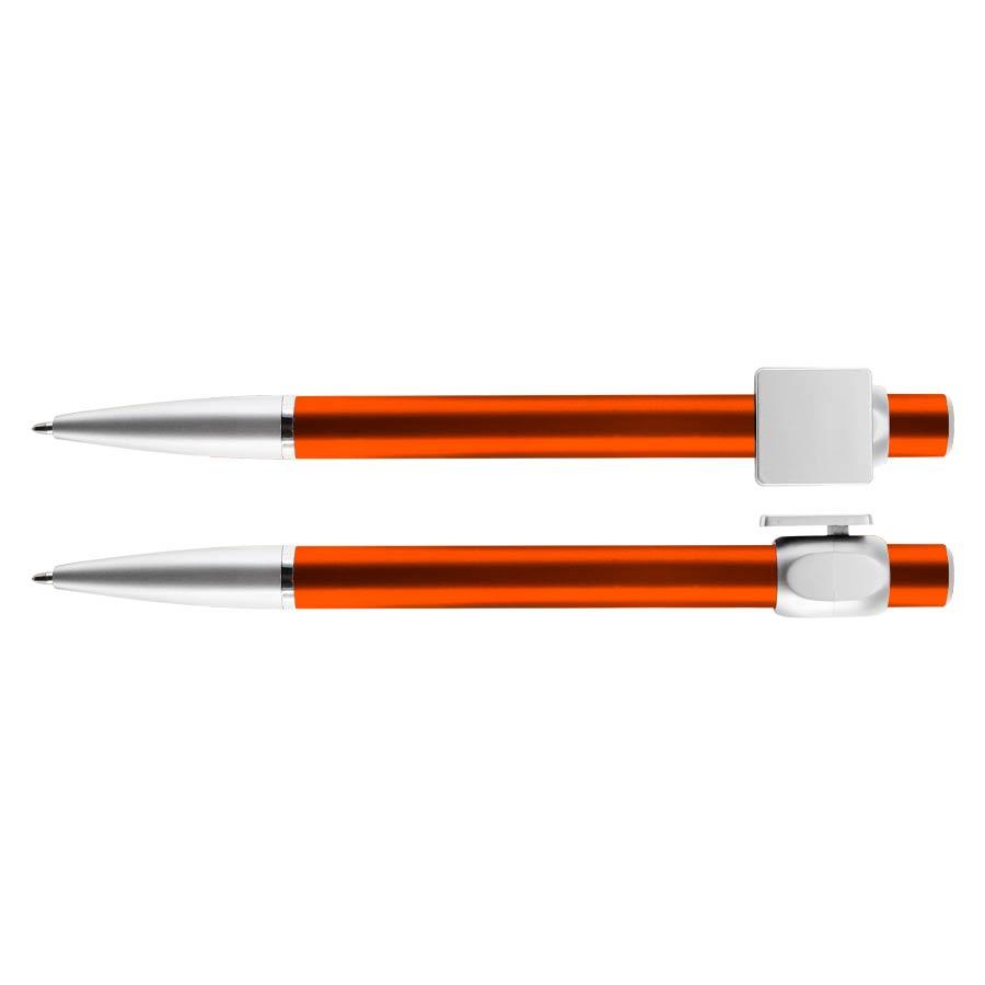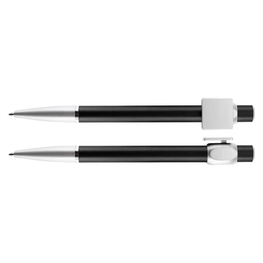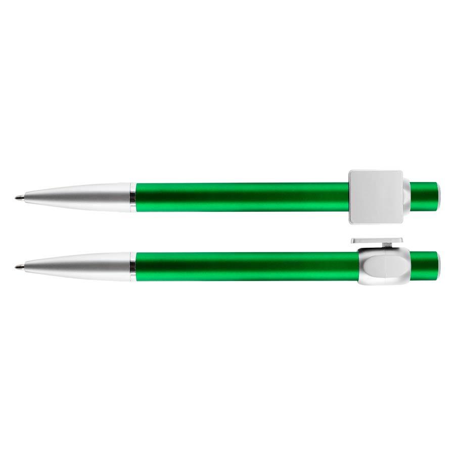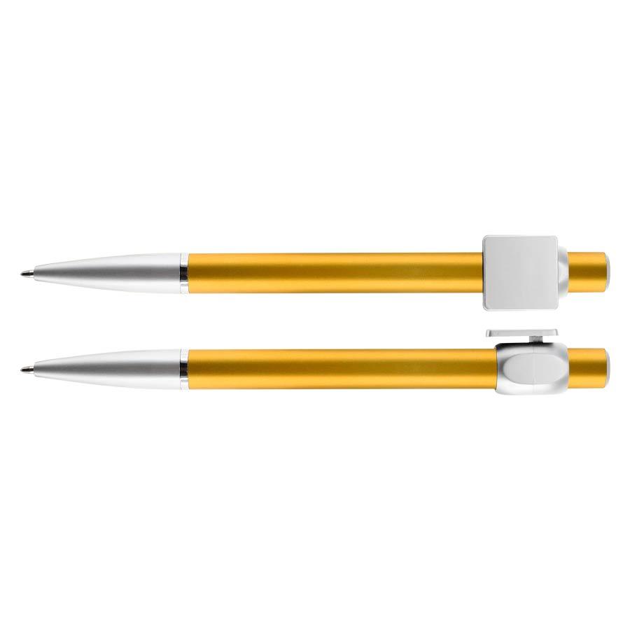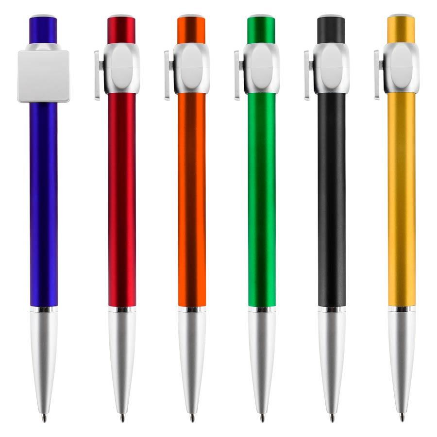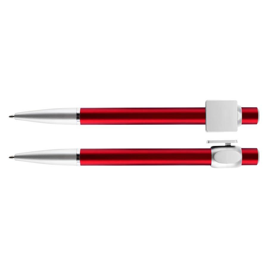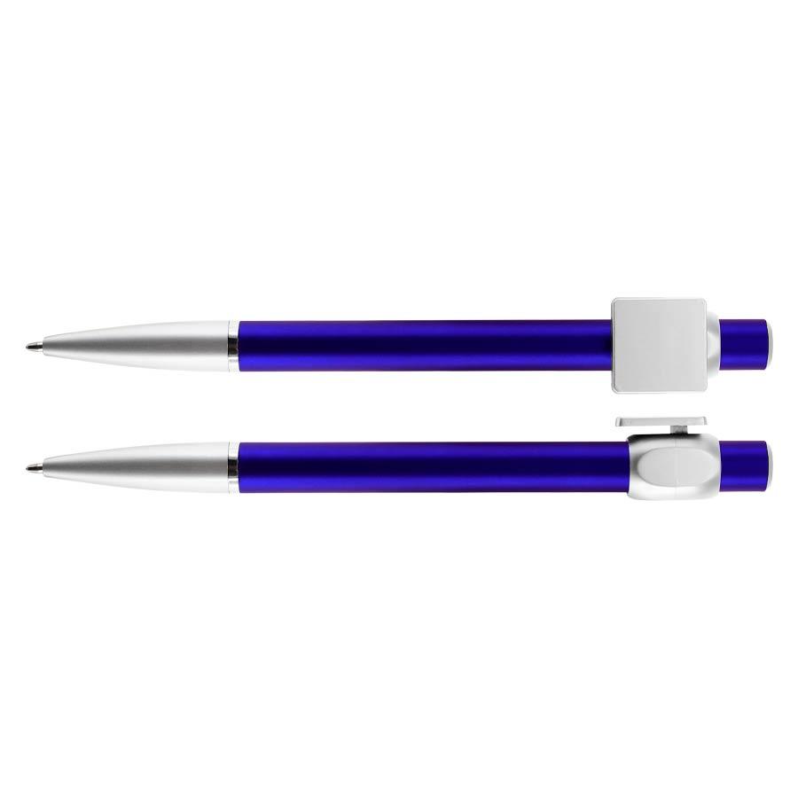 Bolígrafo “Badge” con cuerpo de color metalizado y clip cuadrado plateado, ideal para imprimir isotipos. Escritura azul.