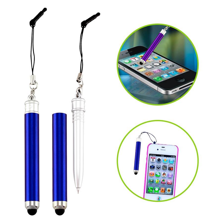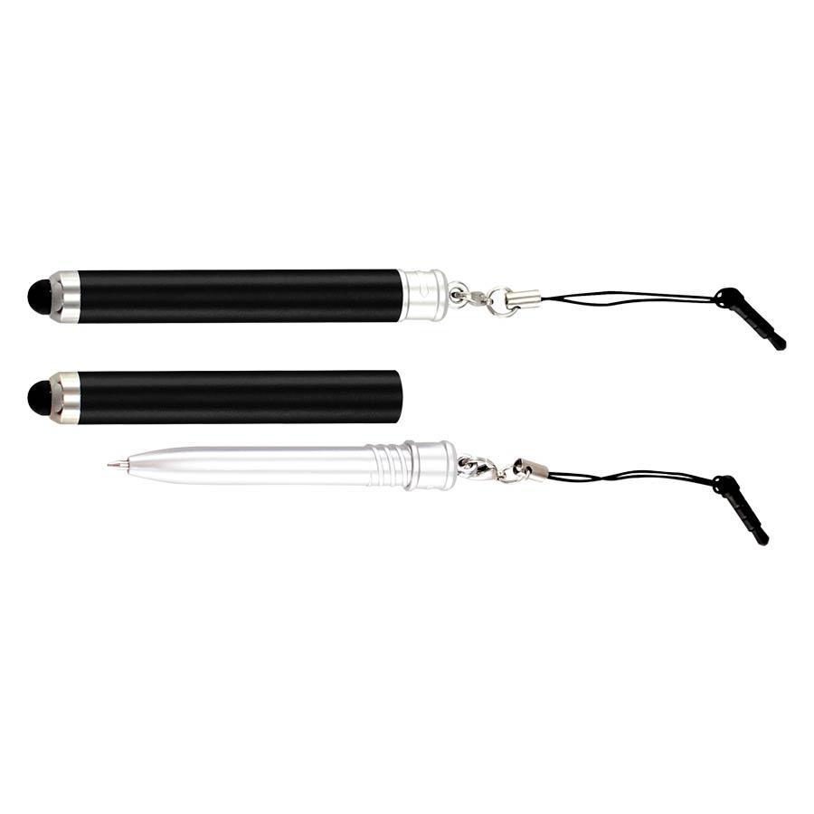 Bolígrafo “Touch-Screen” con cuerpo plateado, tapa de color metalizado y goma posterior negra para pantalla táctil. Incluye práctico soporte plástico para insertar en la salida de auricular del iPhone. Escritura azul.