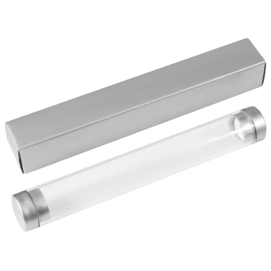 Tubo de Acrílico traslúcido para 1 bolígrafo. Tapas plateadas con superficie lisa. No incluye Bolígrafo.
