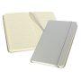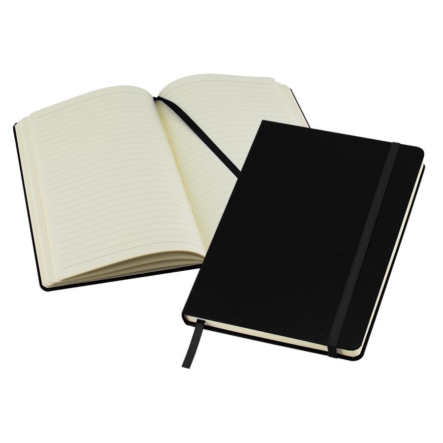 Cuaderno modelo “Colorskine” tamaño A5, con cubierta de cartón piedra forrada en PU simil cuero de color de 1.5mm de espesor. Interior 80 hojas lineadas amarillas de 80gsm. Incluye banda elástica y huincha separador de hojas al tono. Presentación individual en bolsa de polipropileno.