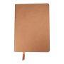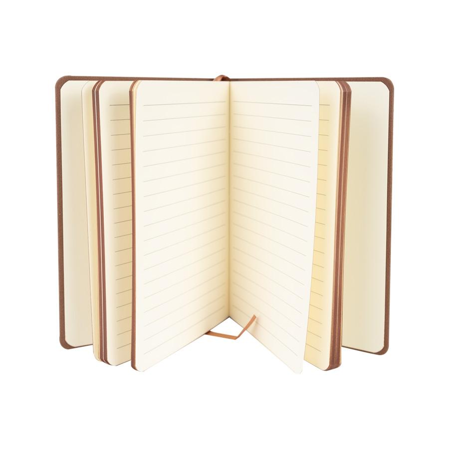Libreta tamaño A6, con cubierta de PU eco-cuero de 2mm de espesor y lomo pintado de color al tono. Interior 80 hojas lineadas amarillas de 80gsm. Incluye banda separador de hojas al tono. Presentación individual en bolsa de polipropileno.