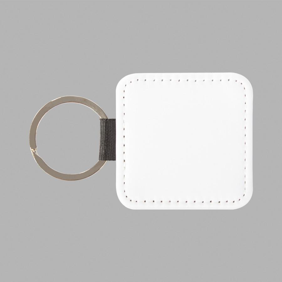 Llavero cuadrado de PU blanco para sublimación. Reverso capa PU negro con brillo (no sublimable). Argolla de Acero inoxidable.