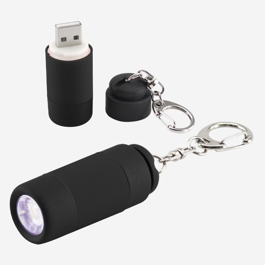 Llavero-Linterna LED con terminal USB para recarga (Batería recargable). Elegante cuerpo de silicona negro/color. Presentación en Estuche de Regalo plateado.