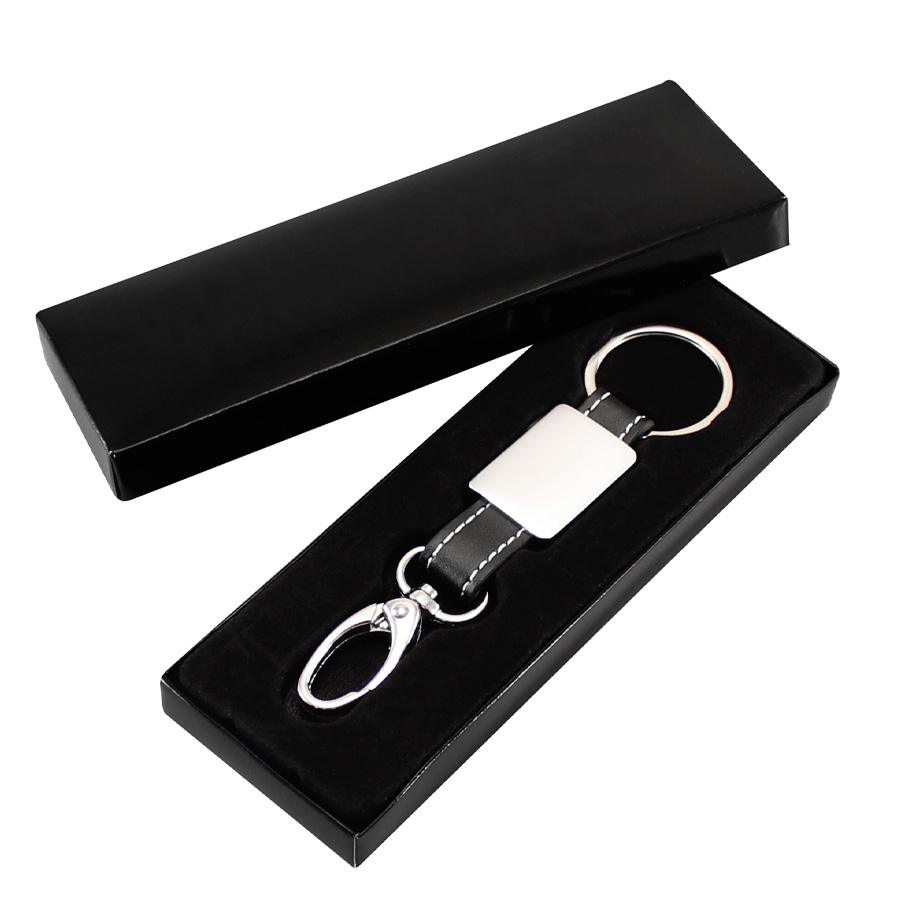 Llavero Metal Eco-cuero modelo “Technic”. Presentación en estuche laminado negro con cuna aterciopelada.