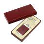 Llavero Metálico con cuerpo de madera barnizada café moro. Presentación en estuche laminado café con cuna aterciopelada.