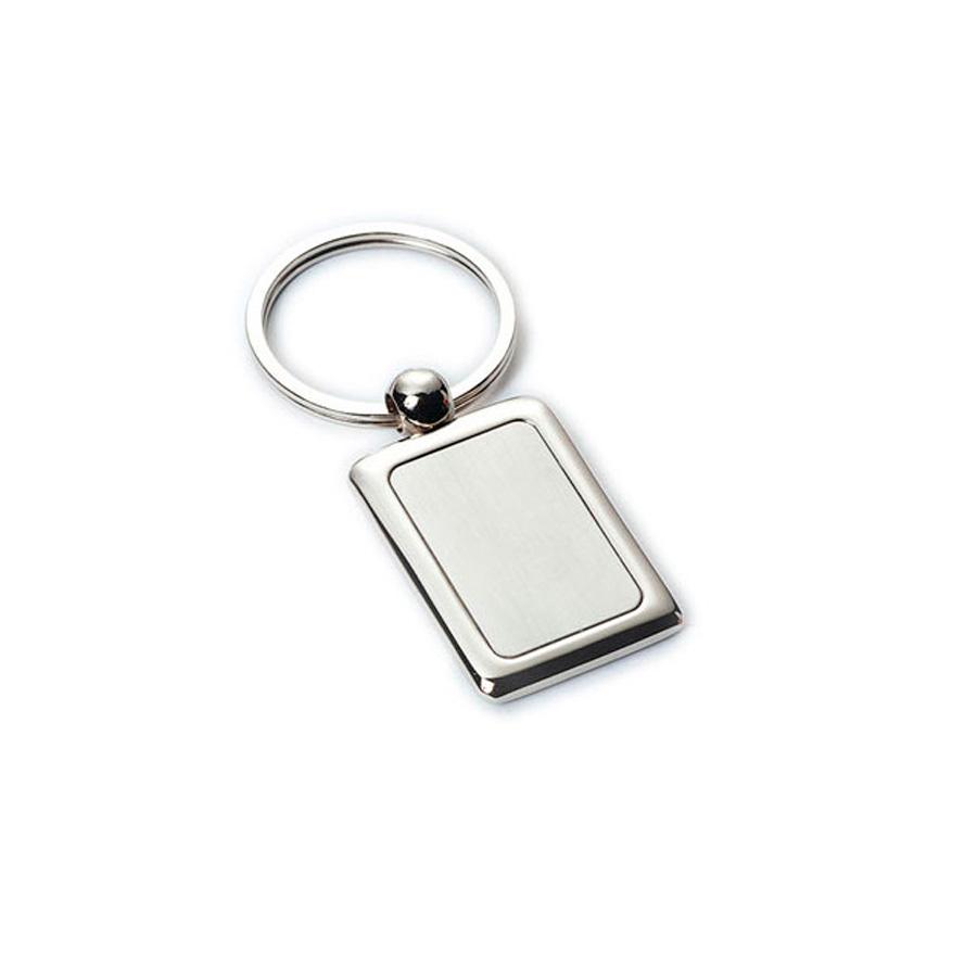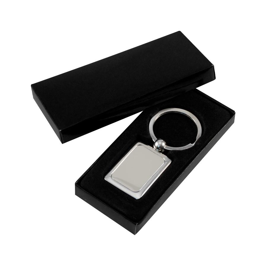 Llavero Metálico Cuadrado. Presentación en estuche laminado negro con cuna aterciopelada.