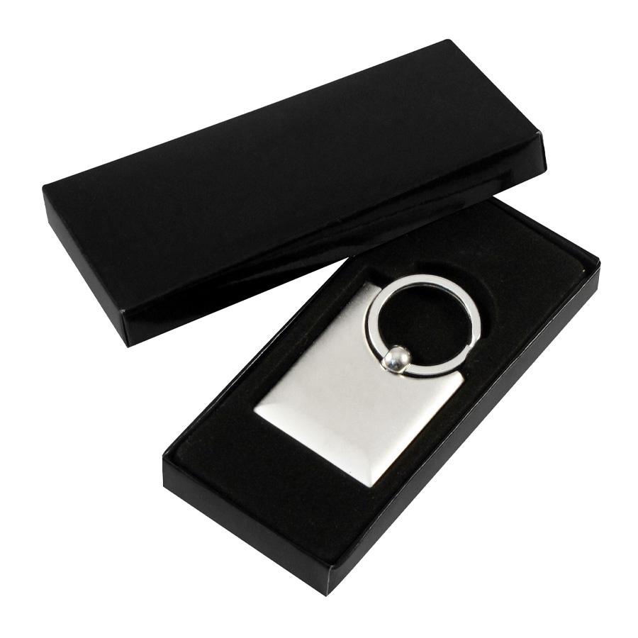 Llavero Metálico satinado, modelo “Bag”. Presentación en estuche laminado negro con cuna aterciopelada.