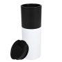 Mug térmico metálico bicolor blanco/negro con doble pared aislante, modelo “HIGHWAY”, interior plástico PP negro, exterior bicolor de Acero inoxidable 201 SS. Producto BPA FREE, para el contacto con líquidos y alimentos. Tapa rosca de plástico PP con sello cilíndrico de silicona y sistema de cierre/apertura antiderrame. Fondo de silicona negra ABS anti-deslizante. Capacidad 450ml. Presentación en bolsa plástica OPP + caja de regalo de cartón laminado negro.