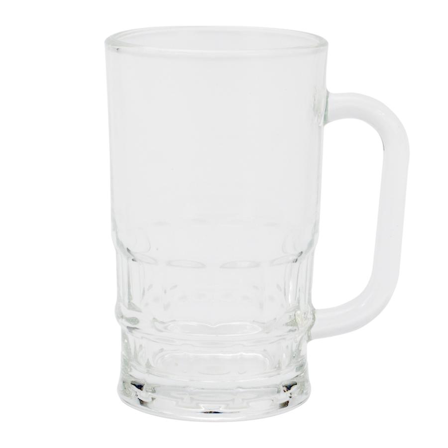 Tazón Cervecero de Vidrio, para Sublimación, para líquidos fríos, con asa. Capacidad 400 ml. Presentación bolsa plástica empavonada + caja de cartón blanco. Calidad Premium ORCA.