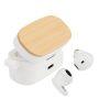 Audífonos auriculares inalámbricos en contenedor de plástico ABS color blanco con tapa de madera de bamboo, función Bluetooth Touch ID, puerto Tipo-C, emparejamiento automático, incluye par de protectores de silicona y manual de instrucciones en inglés y español. Presentación en estuche de cartulina KRAFT natural. Producto amigable con el medio ambiente.