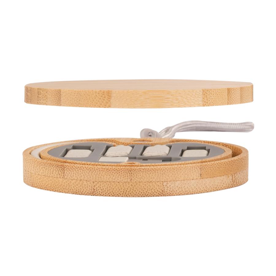 Connect Multicargador 6 en 1, con cuerpo redondo de madera de bamboo con tapa imantada + cables y conectores en fibra de Trigo. Contiene 1 cable con 2 terminales tipo C, 1 adaptador tipo C a i-phone (lightning), 1 adapatador tipo C a Micro USB y 1 adaptador tipo C a USB, todos dentro de cuna de EVA gris. Incluye un lanyard tipo cuerda de nylon gris de 15 cm. de largo. Presentación en bolsa 100% compostable + caja de regalo en cartón color natural.