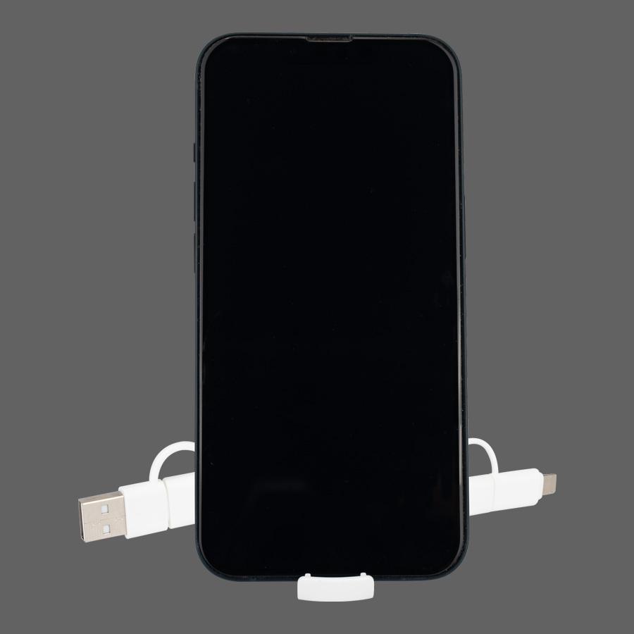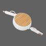 Connect Multicargador plástico ABS retráctil 4 en 1, con cubierta redonda de madera de bamboo. incluye 2 cables de plástico engomado TPE de color de 40cm c/u, con conector USB tipo (Micro-USB / Lightning / Type C) y conector de carga (USB / Type C). Presentación en bolsa 100% compostable + caja de regalo en cartón color natural.
