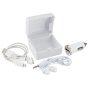 Kit de Carga y Audio. Contiene cargador USB para encendedor / toma de corriente del automóvil, auriculares blancos y multi-cable adaptador USB con 3 terminales (Micro-USB, IPhone (Lightning) y conector 30 pines (IPhone 4). para celulares y tablets. Un kit de emergencia indispensable. Presentación en caja plástica blanca.