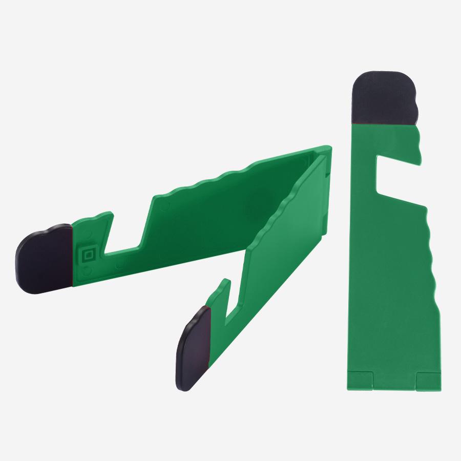 Soporte plástico abatible para iPad y Celular, con goma antideslizante en ambos terminales.